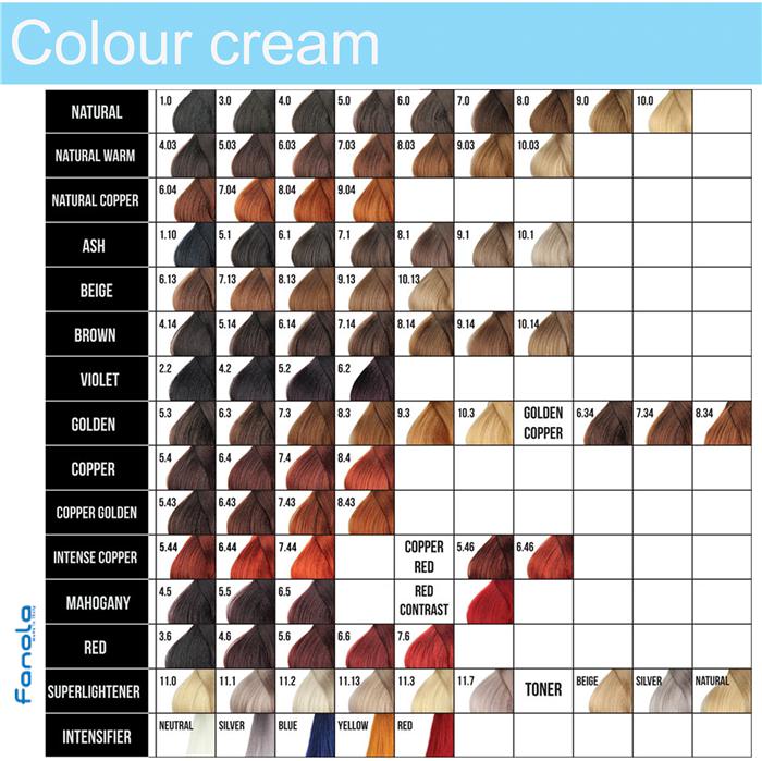 FANOLA dispone de una gama de colores que garantizan siempre resultados absolutamente seguros, fiables y duraderos en el tiempo. La crema colorante FANOLA respeta la piel y el cabello al máximo y permite realizar coloraciones uniformes, luminosas y brillantes.