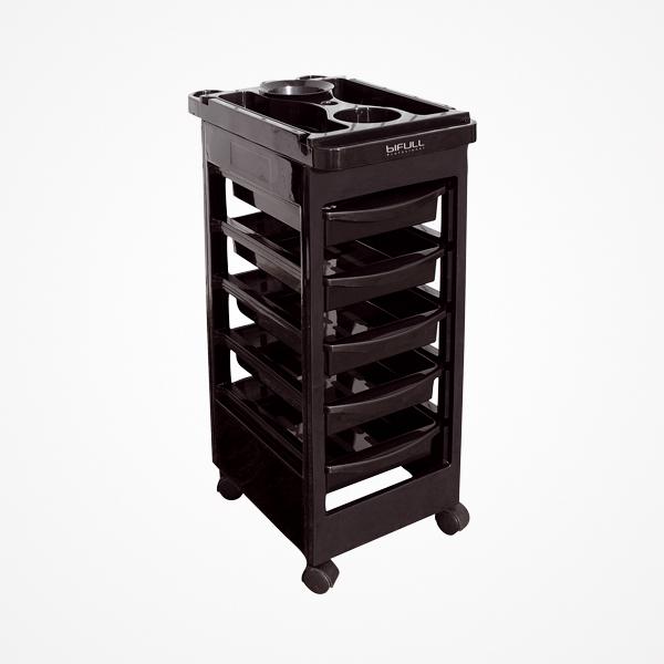 Práctico carrito con ruedecillas silenciosas, 5 cajones extraíbles, bandeja superior con compartimentos y soporte para secador.