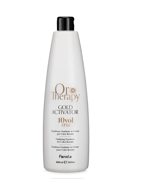El Oro Puro Activador potenciado con Oro Microactivo y Aceite de Argan, para una adhesión mas practica y eficiente en el cabello durante la aplicación del Tinte Queratina, Oro y Argán Sin Amoníaco de Fanola.