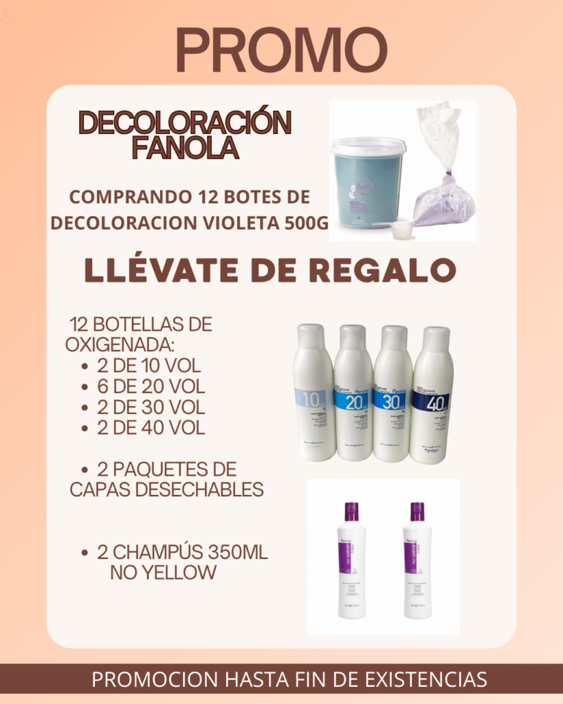Compra 12 cubos de polvo decolorante violeta de 500 g Fanola y TE LLEVAS DE REGALO 12 oxigenadas de 1 litro (especificadas), 2 paquetes de capas desechables de 30 unidades cada una y 2 champús no yellow de 350ml. No dejes desaprovechar ésta súper promoción!!!
