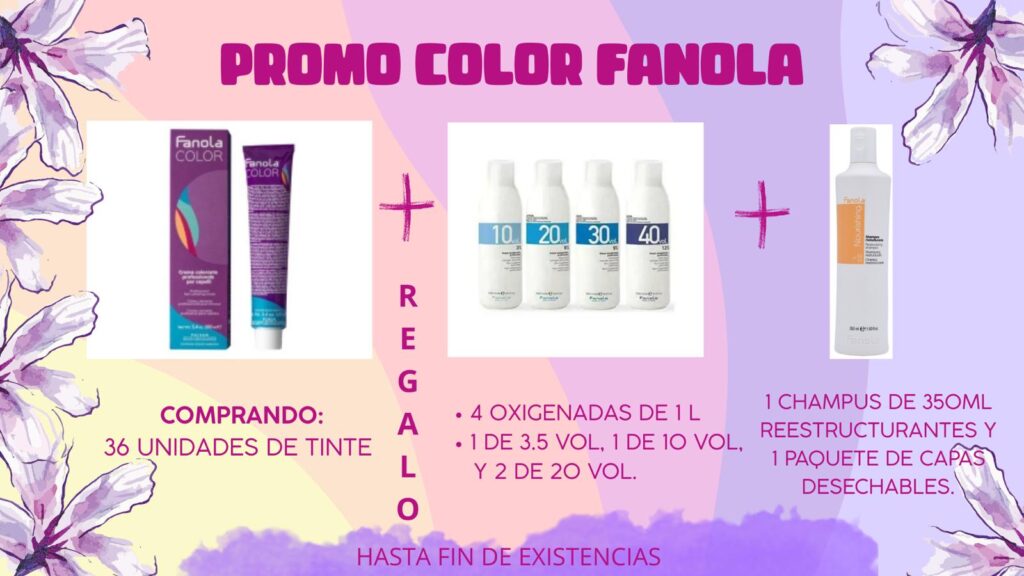 Comprando 36 tubos de tinte de 100 ml Fanola, te llevas de regalo 4 oxigenadas de 1 litro (especificadas), 1 champú reestructurante de 350 ml y 1 paquete de capas de 30 unidades. No te puedes perder está súper promo!!